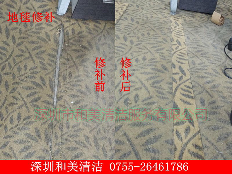 深圳市和美清潔服務(wù)有限公司 0755-26461786 常年承接;深圳南山 福田 寶安 羅湖 布吉 龍華 光明新區(qū)家庭 寫字樓 廠房 公司 店鋪 酒店 店鋪 辦公室 展會(huì) 展廳 會(huì)所 美容院 臺(tái)球館纖維地毯、圈絨地毯、割絨地毯、機(jī)織地毯、簇絨地毯、尼龍地毯、丙綸地毯、羊毛、腈綸、混紡地毯修補(bǔ)。一般寫字樓、辦公室、臺(tái)球館地毯修補(bǔ)的比較多而且面積廣而雜。因?yàn)檫@些地方公共人口流動(dòng)大,踩踏平凡。特別是女性的高跟鞋最容易踩壞地毯的接口處。一般往往如果不是太麻煩客戶都愿意重新?lián)Q新地毯,可是辦公地方卡位多、配電布線密集,更換時(shí)費(fèi)事費(fèi)力,影響上班時(shí)間。在沒有選擇的條件下才進(jìn)行修補(bǔ)。